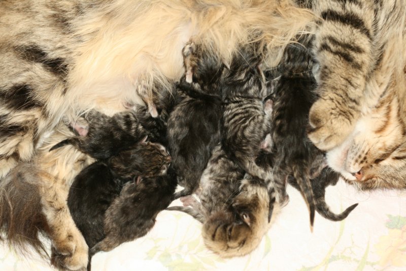 Claudia ja 8 ruskeatiikeri vauvaa: 3 tyttöä ja 5 poikaa/ Claudia and 8 black mackerel babies 3 girls and 5 boys