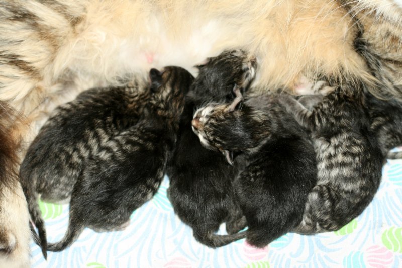 Carupita 7 suloisen vastasyntyneen vauvansa kanssa/ Carupita wiht her seven sweet new born kittens