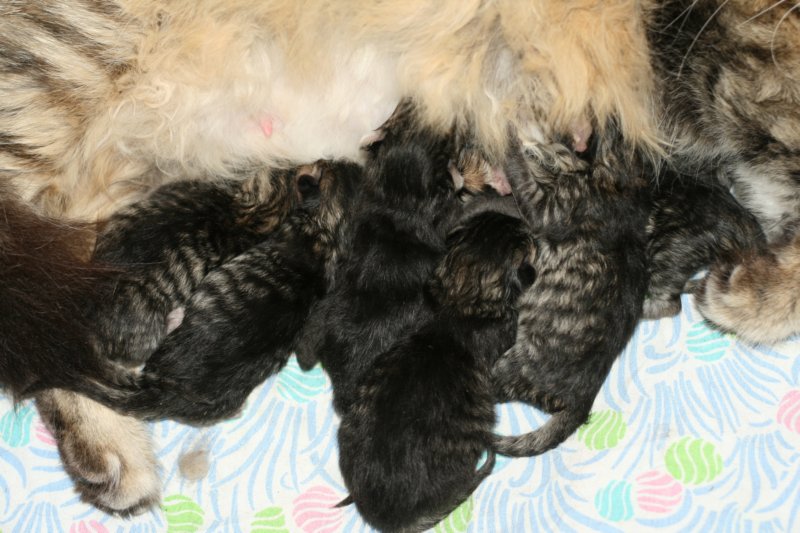 Carupita 7 suloisen vastasyntyneen vauvansa kanssa/ Carupita wiht her seven sweet new born kittens